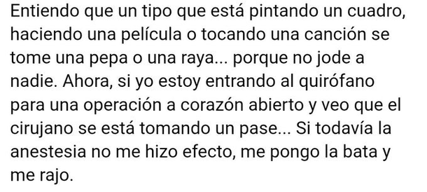 Inmediatamente después, el artista lanzaba una cruda advertencia que hoy resuena como una premonición exacta del caos investigado: "Ahora, si yo estoy entrando al quirófano para una operación a corazón abierto y veo que el cirujano se está tomando un pase... Si todavía la anestesia no me hizo efecto, me pongo la bata y me rajo".
