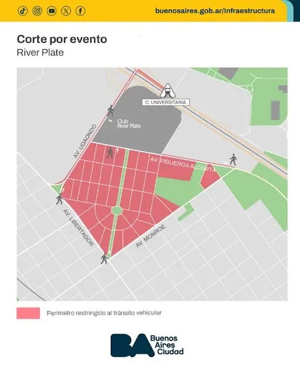 Paralelamente, la Dirección de Tránsito de la Ciudad de Buenos Aires desplegará una serie de cortes y desvíos en las inmediaciones del estadio. Habrá corte parcial de Av. Pres. Figueroa Alcorta entre Av. Monroe y Av. Guillermo Udaondo desde el jueves 13 de noviembre a las 13 hasta el lunes 17 a las 22. A su vez, se definió el corte total del perímetro comprendido entre Av. Del Libertador, Av. Udaondo, Av. Pres. Figueroa Alcorta y Monroe, además del corte total de Av. Guillermo Udaondo entre Av. Pres. Figueroa Alcorta y Colectora Int. Cantilo, la interrupción de los accesos por Int. Cantilo al Puente Labruna, y el cierre total de Campos Salles y Tte. Ricchieri entre Av. Del Libertador y Av. Guillermo Udaondo.