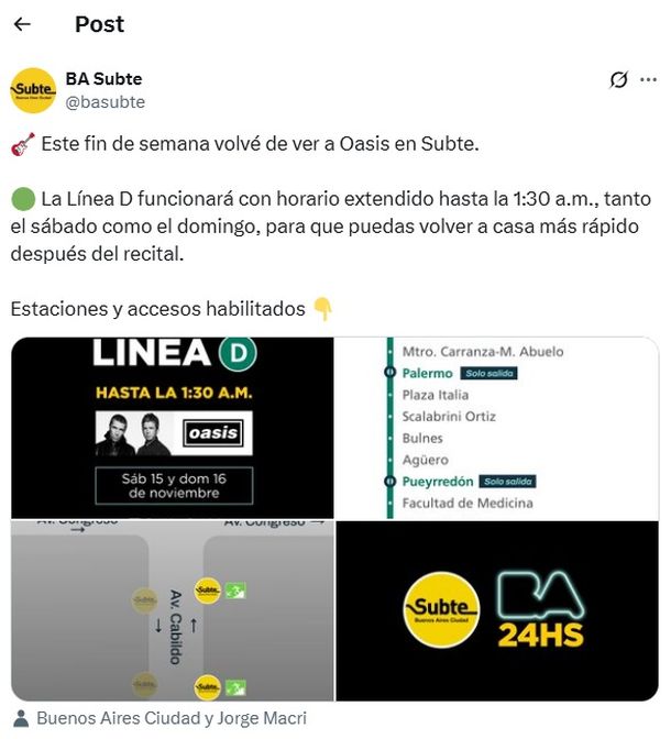 El dispositivo contempla el ingreso exclusivo por Congreso de Tucumán y la salida habilitada en Olleros, Palermo, Pueyrredón y 9 de Julio. “Este fin de semana volvé de ver a Oasis en Subte. La Línea D funcionará con horario extendido hasta la 1:30 a.m., tanto el sábado como el domingo, para que puedas volver a casa más rápido después del recital”, informó la cuenta oficial de Subterráneos de Buenos Aires en X, acompañando el anuncio de la Ciudad.