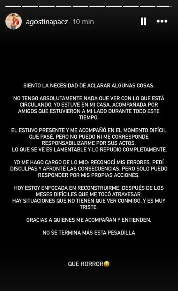 En paralelo, la joven también hizo referencia a su propio recorrido reciente, intentando marcar una diferencia respecto de lo ocurrido. Así, aseguró que “yo me hago cargo de lo mío: reconocí mis errores, pedí disculpas y afronté las consecuencias”, dejando en claro que ya asumió su responsabilidad en el episodio que protagonizó meses atrás.