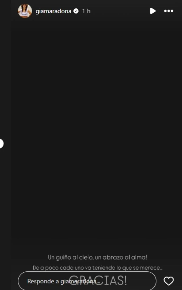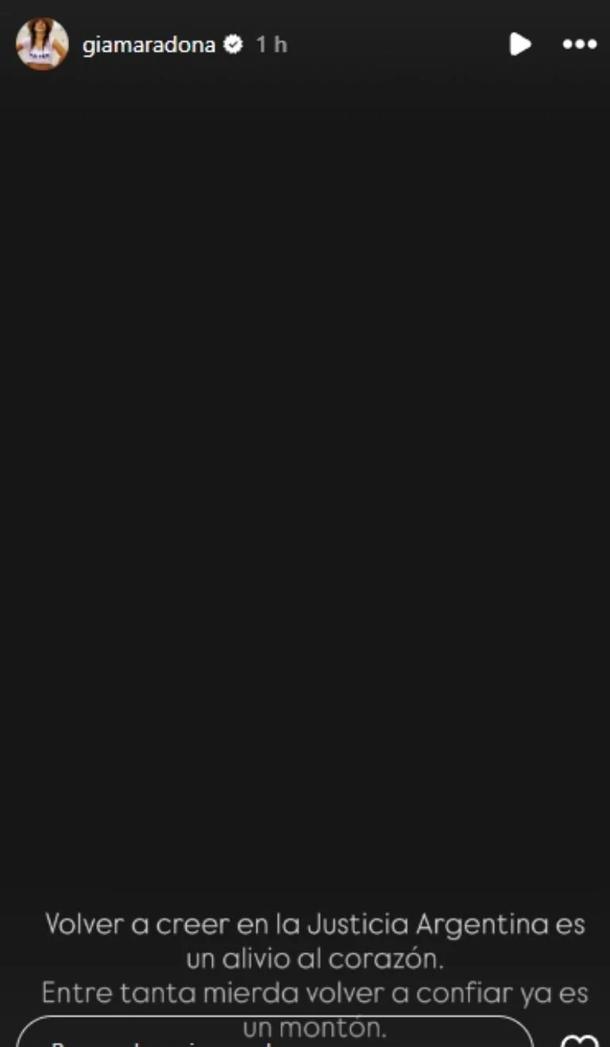 La decisión, que sacudió el ámbito judicial y mediático, generó múltiples reacciones, pero una de las más resonantes fue la de Gianinna Maradona, que expresó su sentir a través de Instagram con frases directas que reflejaron tanto su alivio como el desgaste emocional de estos años. En sus historias, Gianinna comenzó con una placa en negro donde escribió: "Será justicia", acompañada por “Puente”, de Gustavo Cerati, un guiño musical que reforzó el tono de desahogo.