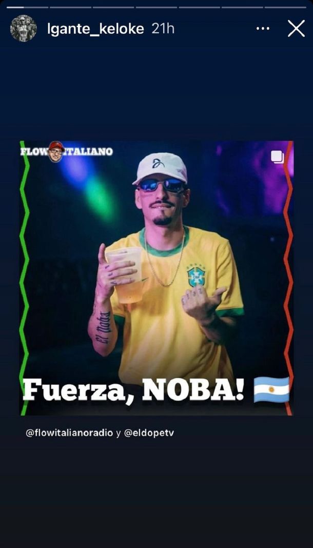 Para acompañar a su familia, amigos y seguidores en este duro momento, L-Gante posteó en cuenta de Instagram un foto de L-Gante en la que viste una camiseta de la Selección de Brasil y sostiene un vaso de cerveza en su mano. Junto a la imagen escribió "Fuerza Noba!"