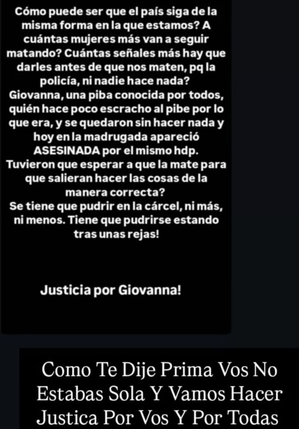 Además, recordó que Giovana había advertido sobre su agresor: “Giovana, una piba conocida por todos, quien hace poco escrachó al pibe por lo que era y se quedaron sin hacer nada. Y apareció asesinada por el mismo hijo de p... ¿tuvieron que esperar a que la matara para que salieran a hacer las cosas de la manera correcta?”.