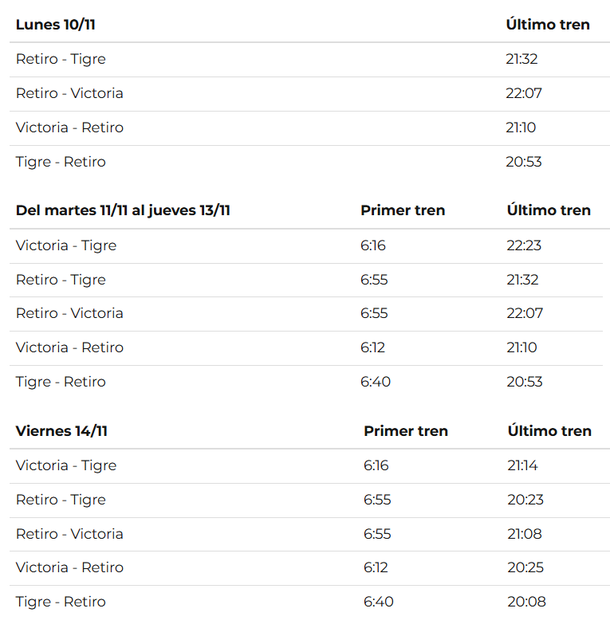 La interrupción total del servicio del ramal Tigre del tren Mitre se llevará a cabo entre el viernes 21 y el lunes 21 de noviembre inclusive. El servicio retomará su funcionamiento normal el martes 25, según informaron desde la empresa Trenes Argentinos.