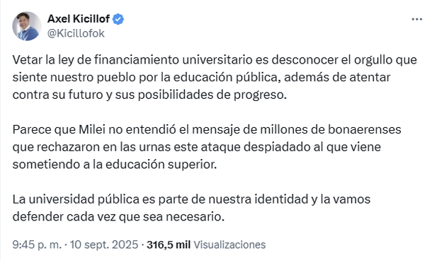 En esta línea, haciendo referencia al resultado de las elecciones legislativas de la provincia de Buenos Aires, donde Fuerza Patria superó a La Libertad Avanza, Kicillof consideró: “Parece que Milei no entendió el mensaje de millones de bonaerenses que rechazaron en las urnas este ataque despiadado al que viene sometiendo a la educación superior”.