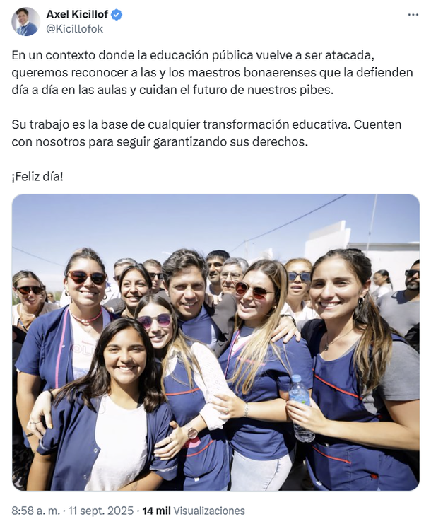 “En un contexto donde la educación pública vuelve a ser atacada, queremos reconocer a las y los maestros bonaerenses que la defienden día a día en las aulas y cuidan el futuro de nuestros pibes. Su trabajo es la base de cualquier transformación educativa. Cuenten con nosotros para seguir garantizando sus derechos. ¡Feliz día!”, publicó el gobernador en su cuenta de la red social X.