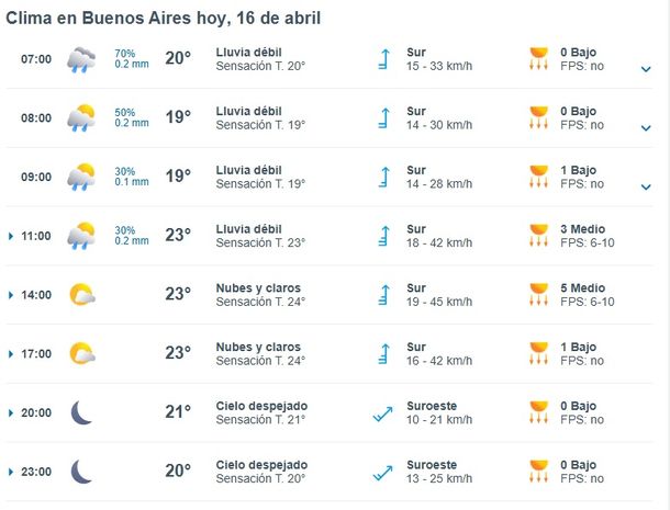 Para la tarde, también se esperan precipitaciones de igual intensidad, aunque con el correr de las horas se aguarda por un descenso en la frecuencia de la caída de agua. Finalmente, las últimas horas del día tendrán un cielo mayormente nublado, pero ya sin lluvias.