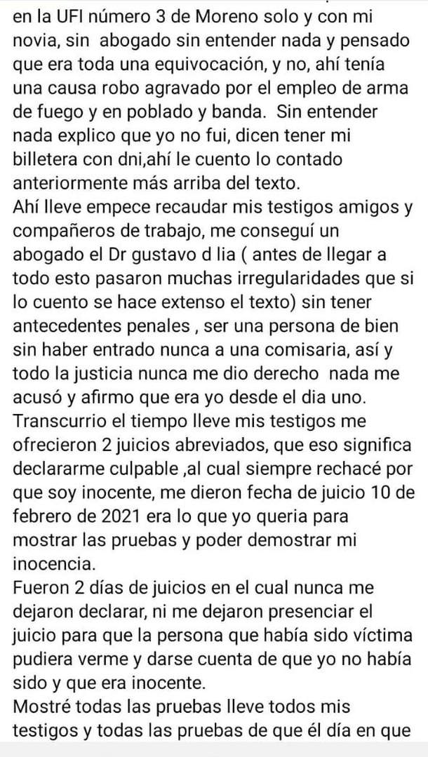 Posteriormente, el 14 de marzo, comienza un infierno: "El día 14 de marzo van a robar a la localidad de Moreno con mi billetera "con mi dni" (para todo esto yo en mi trabajo sin saber nada, en ese momento estaba trabajando en Speed, en Ramos Mejía). El 22 de marzo me levanto con la noticia de que habían allanado la casa de mi mamá, acusándome de un robo que yo no cometí y ahí arranca toda mi odisea", reveló en aquel momento el joven en Facebook.