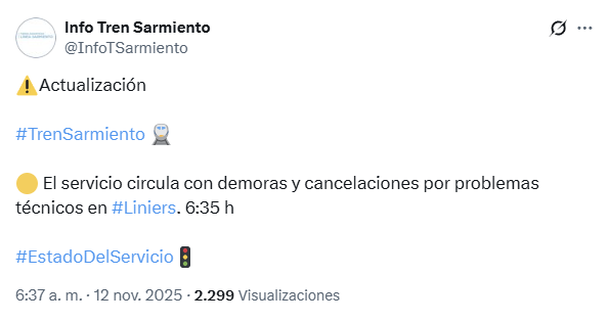 Trenes Argentinos informó que el retraso se debe a problemas técnicos en la estación Liniers, donde el martes alrededor de las 15:50 una formación del tren de la línea Sarmiento se descarriló cerca de la estación Liniers, a unos cien metros de un paso a nivel ubicado en la zona de la intersección de Timoteo Gordillo y Avenida Rivadavia.