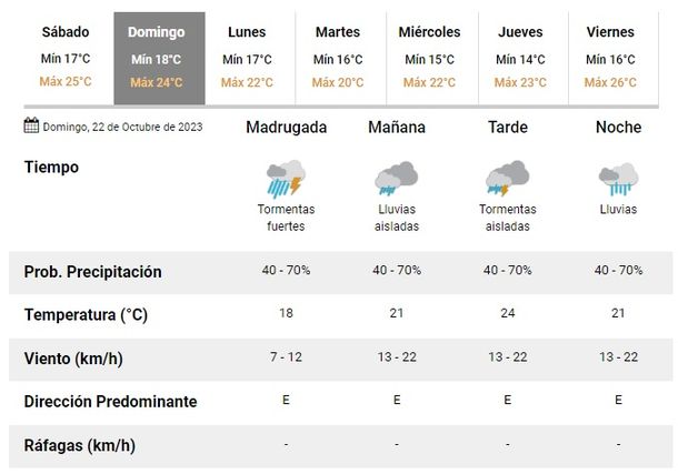 Para el lunes 23 de octubre se esperan vientos fuertes del este con ráfagas, una temperatura que irá de los 17 a los 22 grados y tormentas aisladas durante todo el día.