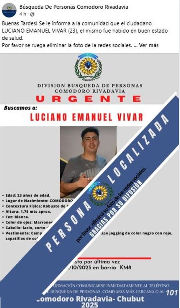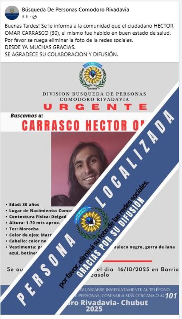 En las últimas horas, la policía de Chubut confirmó que lograron encontrar en buen estado de salud a Luciano Emanuel Vivar (23) y Héctor Omar Carrasco (30), quienes estaban desaparecidos en Comodoro Rivadavia hace una semana.