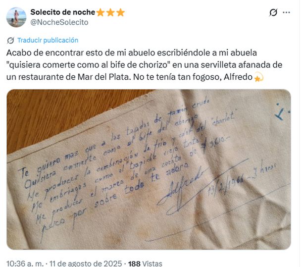 "Acabo de encontrar esto de mi abuelo escribiéndole a mi abuela 'quisiera comerte como al bife de chorizo', en una servilleta afanada de un restaurante de Mar del Plata. No te tenía tan fogoso, Alfredo", contó este lunes Marina Rodríguez Felder a través de su perfil de X, donde compartió la foto del mensaje de su abuelo por el cumpleaños de su abuela.
