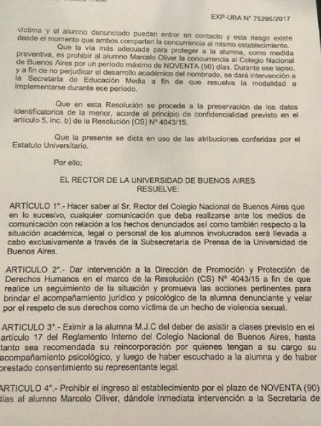 Una resolución firmada por el rector de la Universidad de Buenos Aires, Alberto Barbieri, ordenó prohibirle el ingreso al colegio por 90 días al alumno de 5° año acusado de abuso durante la toma del Colegio Nacional de Buenos Aires. Estableció, además, que sea la Secretaría de Educación Media la que resuelva la forma en que el joven continúe con su desarrollo académico.