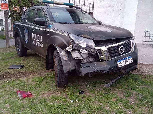 El impacto fue tal que tanto la camioneta de la Policía como el auto terminaron subidos a la vereda, chocando contra la casa de la esquina y contra otro vehículo que estaba estacionado.