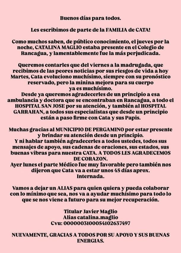 “Del viernes a la madrugada, que recibimos de las peores noticias por sus riesgos de vida, a hoy martes, Cata evolucionó muchísimo. Siempre con su pronóstico reservado, pero la mínima mejora para su cuerpo ya es muchísimo”, expresaron sus familiares en el mensaje difundido públicamente en redes sociales.