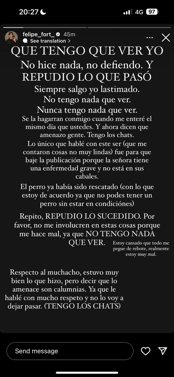 Finalmente, Felipe Fort rompió el silencio a través de sus redes sociales y contó los detalles del intercambio de mensajes: "QUE TENGO QUE VER YO. No hice nada, no defiendo. Y REPUDIO LO QUE PASÓ. Siempre salgo yo lastimado. No tengo nada que ver. Nunca tengo nada que ver. Se la hagarran (sic) conmigo cuando me enteré el mismo día que ustedes. Y ahora dicen que amenazo gente. Tengo los chats", escribió.