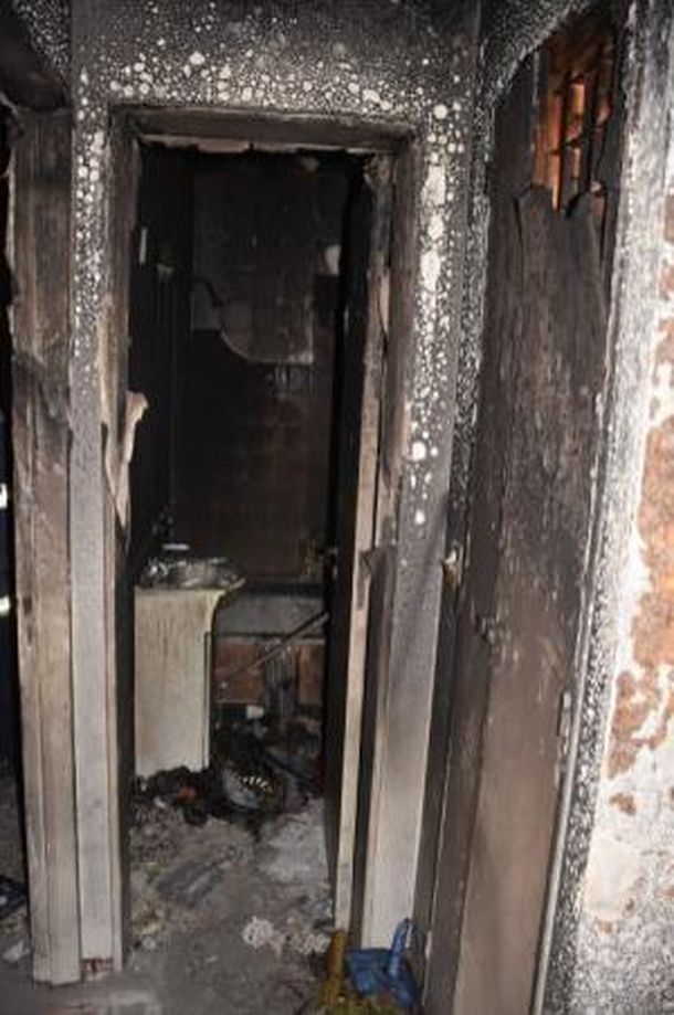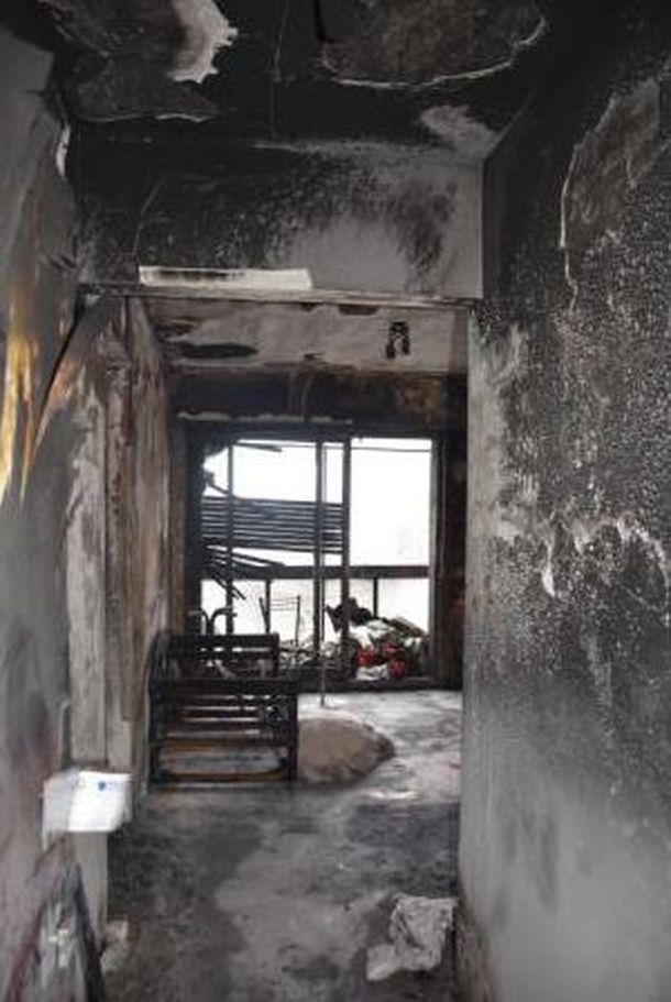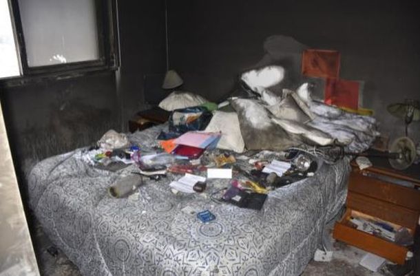 También se captura la escena de una habitación, tal vez el ambiente menos afectado por el fuego. Se ve una mesa de luz que no se quemó, con los cajones abiertos. Y un desorden de artículos no identificables sobre una cama de dos plazas, con un cobertor que no se prendió fuego.