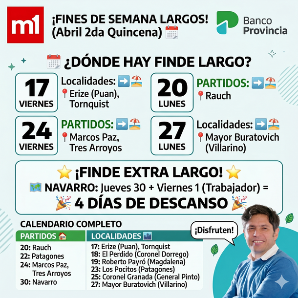 El banco provincial decretó nuevos feriados para la segunda quincena de abril. Varias localidades bonaerenses disfrutarán de un esperado fin de semana largo.