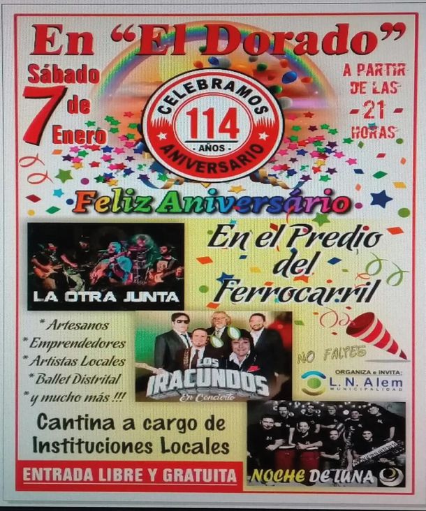 En tanto, la municipalidad de El Dorado organiza un evento de entrada libre y gratuita para este sábado 7 de enero a las 21, para que todos sus habitantes festejen los 114 años de la localidad.