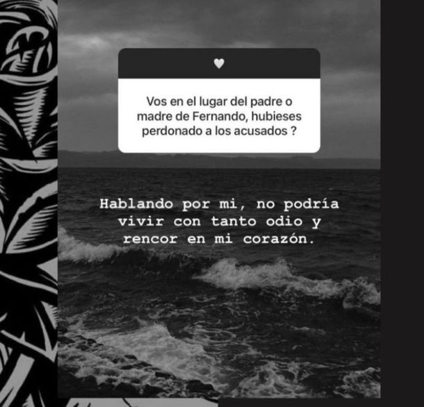 Además, consultados mediante una encuesta en las historias de Instagram sobre si hubieran perdonado a los acusados respondieron: "Hablando por mi, no podría vivir con tanto odio y rencor en mi corazón".