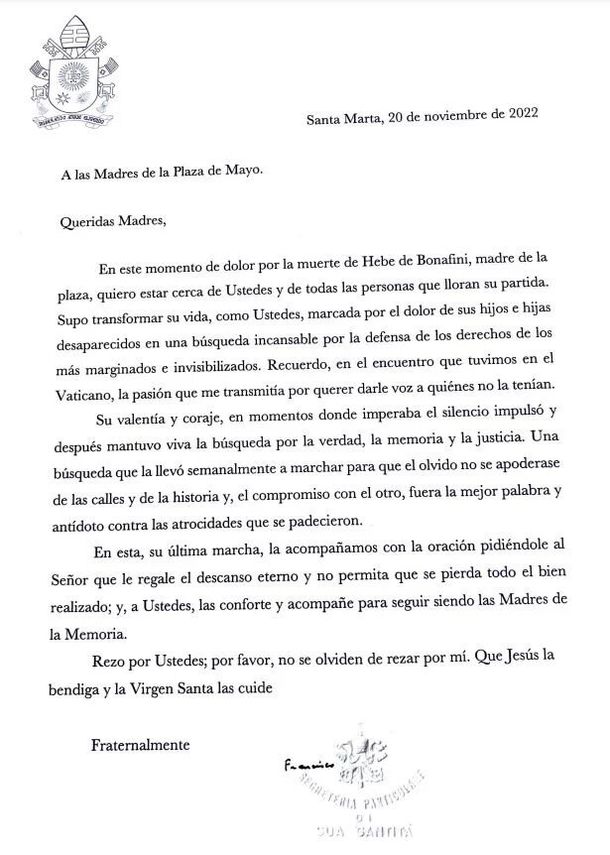 En el texto, encabezado con un "Queridas Madres", Francisco expresó: "En este momento de dolor por la muerte de Hebe de Bonafini, madre de la plaza, quiero estar cerca de ustedes y de todas las personas que lloran su partida. Supo transformar su vida, como ustedes, marcada por el dolor de sus hijos e hijas desaparecidos en una búsqueda incansable por la defensa de los derechos de los más marginados e invisibilizados".