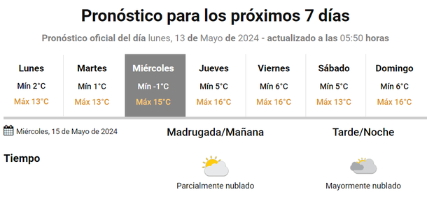 El martes 14 de mayo la temperatura mínima se ubicará en 1 grado y lo peor llegará el miércoles, jornada en la que se espera una mínima de un grado bajo cero.