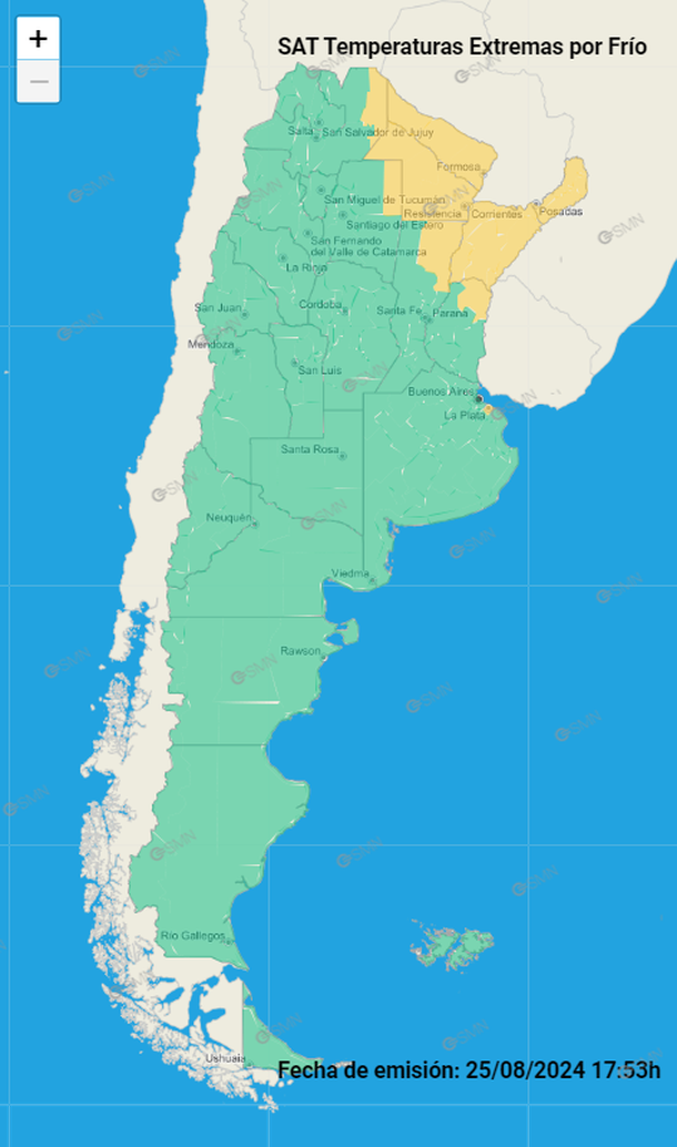 El Servicio Meteorológico Nacional emitió un alerta amarilla por frío que abarca a nueve provincias de Argentina, afectando principalmente a la zona noreste del país, donde se esperan temperaturas mínimas promedio desde los 0°C hasta los 5°C, mientras que las máximas rondarán los 15°C.