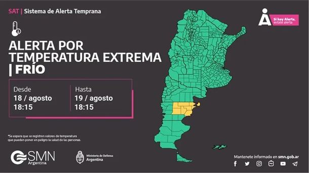 El Servicio Meteorológico Nacional (SMN) emitió este lunes alertas amarillas por frío extremo, lluvias y nevadas para 20 localidades argentinas donde este lunes se esperan mínimas bajo cero y precipitaciones de variada intensidad que pueden darse en forma de agua y nieve mezclada.