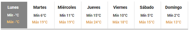 Sin embargo, a partir del viernes se viene el descenso de las temperaturas: entre 10 y 18 el viernes, con chaparrones mañaneros y cielo algo nublado; 5 de mínima y 15 de máxima para el sábado, con cielo parcialmente nublado; y entre 2 y 13 grados para el domingo, junto con cielo de algo a parcialmente nublado.