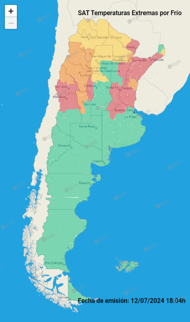 Según el SMN, el norte de la provincia de Buenos Aires, Córdoba, Santa Fe, Entre Ríos, Corrientes, Misiones, Chaco, Formosa, Santiago del Estero, San Luis, Mendoza, San Juan, La Rioja, Catamarca, Tucumán, Jujuy y Salta se verán afectados por temperaturas bajo cero. Después de varios días, el fenómeno no golpeará directamente al AMBA. De igual forma, rigen diferentes niveles de alertas en cada región.