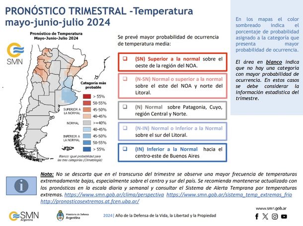 “No se descarta que en el transcurso del trimestre se observe una mayor frecuencia de temperaturas extremadamente bajas, especialmente sobre el centro y sur del país”, advirtieron al respecto desde el Servicio Meteorológico donde explicaron que “el pronóstico indica las probabilidades previstas para cada categoría (superior, normal e inferior), en cada región señalada y para el trimestre pronosticado”.