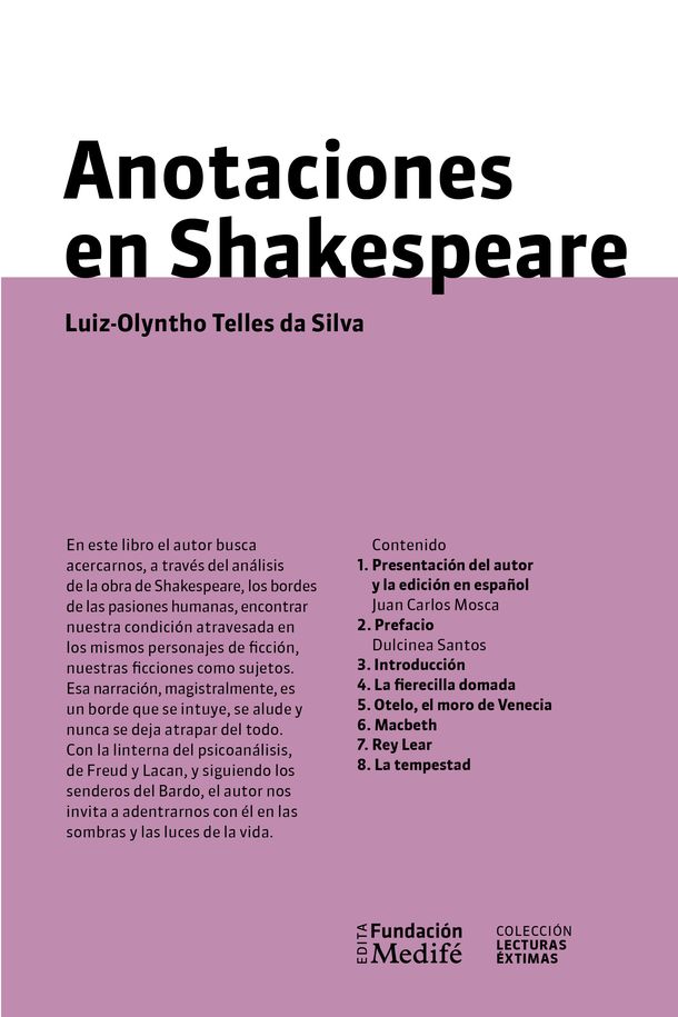 “Anotaciones en Shakespeare” está compuesta por seis ensayos, todos ellos introducidos por uno o más epígrafes y constituye una valiosa brújula para sus lectores. Además de contener comentarios acertados, fundamentados en su consistente y vasta formación literaria–ya reconocido por su erudición– adquirida gracias a la lectura de los mejores nombres de la literatura universal, Luiz-Olyntho Telles Da Silva brinda la sinopsis de las obras, indicándonos sus fuentes. Nos muestra su historia teatral y nos presenta la perspectiva cultural de algunos elementos de la obra.