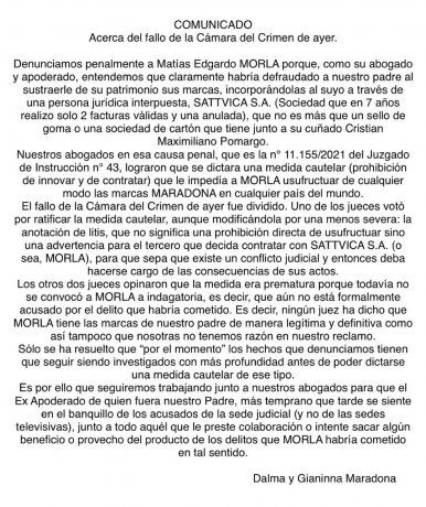 A través de Twitter, Dalma y Gianinna Maradona dieron a conocer un comunicado luego de que la Justicia le otorgara el control de la marca Maradona a Matías Morla.