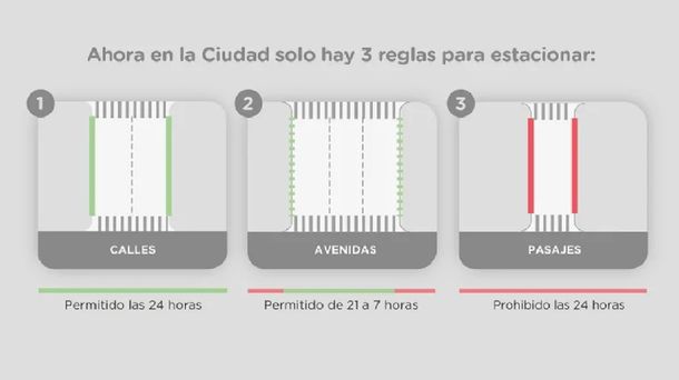 Como la idea era simplificar el estacionamiento, la medida implica pasar de 9 reglas a sólo 3, en las que sólo se señalizará la excepción: por ejemplo, una calle donde está prohibido estacionar de mano izquierda, una avenida con prohibiciones o permitidos diferentes a la regla general (de 21 a 7), o algunas ciclovías en particular que permiten el estacionamiento en paralelo. Cabe señalar que en todos los casos siguen siendo válidos los cordones pintados de amarillo, que indican la prohibición de estacionar durante las 24 horas del día.