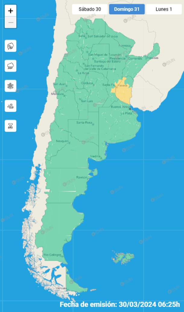 El SMN puso en alerta para este domingo por cuestiones climáticas al sur de la provincia de Santa Fe y a casi todo el territorio de Entre Ríos.