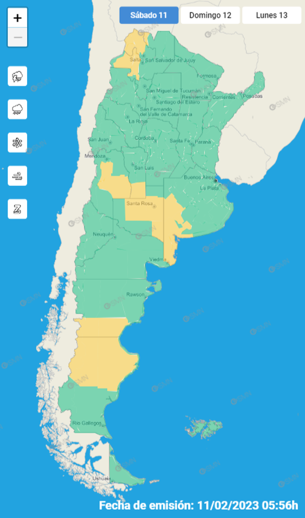 El Servicio Meteorológico Nacional (SMN) emitió varias alertas amarillas por tormentas, con posible caída de granizo, para la jornada de este sábado 11 de febrero de 2023.