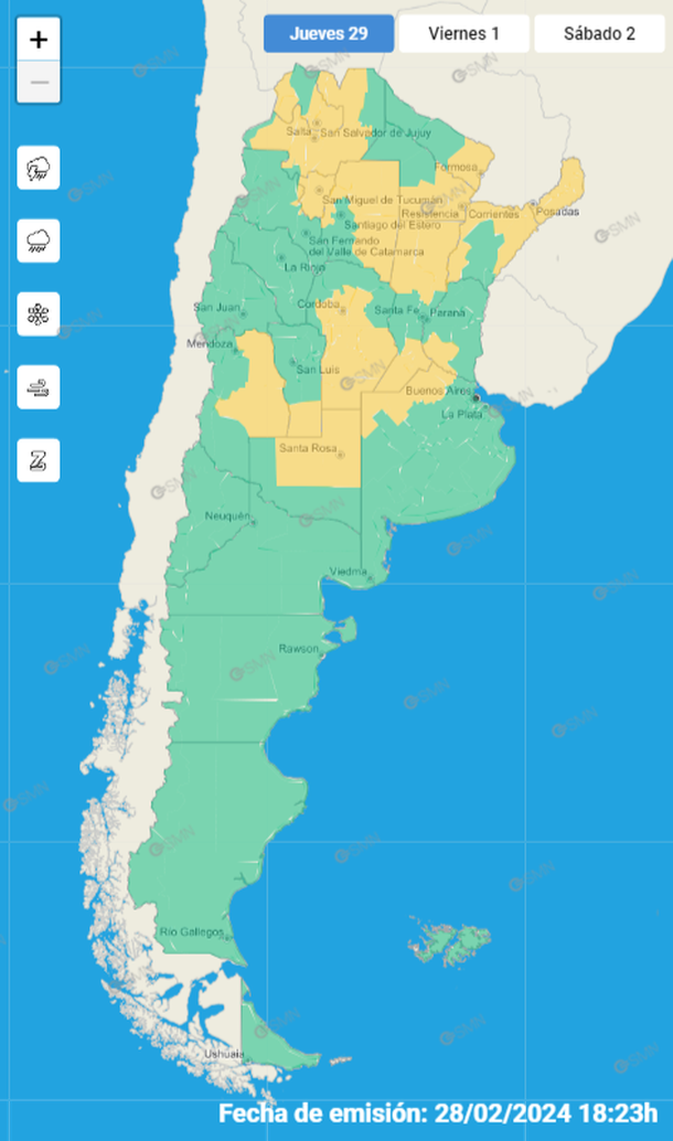 El noroeste de Buenos Aires y 15 provincias más están con alerta amarilla por lluvias fuertes, con ocasional caída de granizo, para este jueves 29 de febrero de 2024.