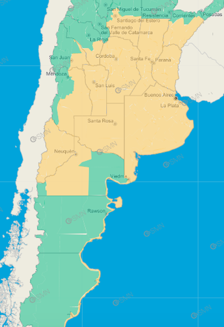 La costa de Río Negro, Chubut y Santa Cruz: "El área será afectada por vientos del sector oeste rotando al sector Sur, con velocidades entre 50 y 70 km/h, y ráfagas que pueden alcanzar entre 80 y 90 km/h".