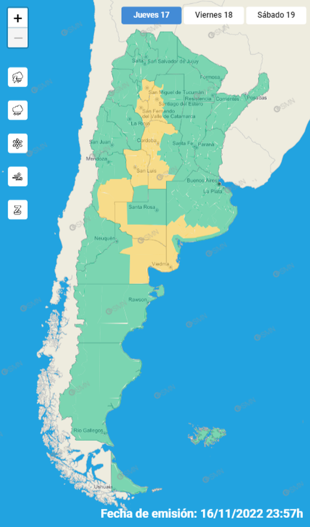 Al mismo tiempo, hay otro aviso de carácter amarillo para zonas de Catamarca, Córdoba, San Luis, Santiago del Estero y Tucumán.