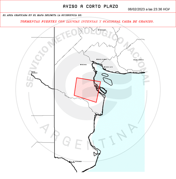 Además, hay un aviso a corto plazo por tormentas fuertes con lluvias intensas y ocasional caía de granizo que rige para la localidad bonaerense de Villarino.