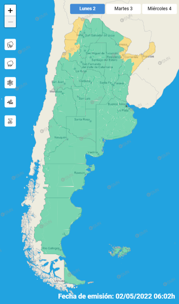 Se trata de un alerta amarillo que rige este lunes para zonas de las provincias de Corrientes, Chaco, Misiones y Formosa.