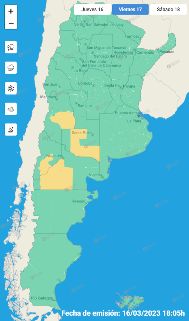 Las provincias que están bajo alerta amarilla este viernes son Río Negro, Neuquén, La Pampa y Mendoza.