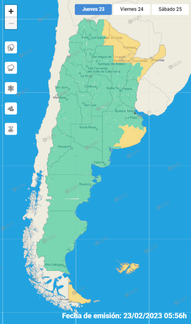 Cinco provincias del norte y el sudeste de la provincia de Buenos Aires están bajo alerta amarillo por tormentas fuertes, informó hoy el reporte del Servicio Meteorológico Nacional (SMN).
