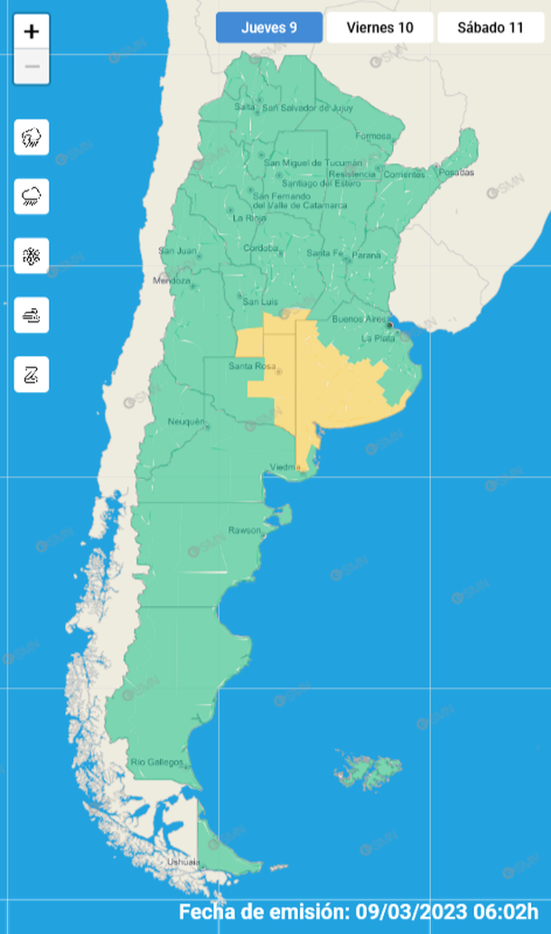 El Servicio Meteorológico Nacional (SMN) emitió esta mañana alertas amarillo por tormentas en las provincias de Buenos Aires, La Pampa, San Luis y Córdoba, donde hay una advertencia por vientos fuertes.