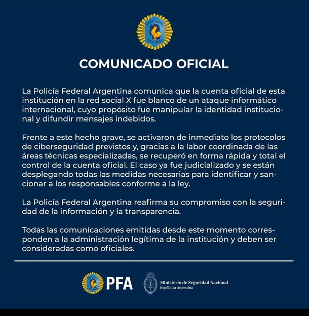 Las Fuerzas de Seguridad al mando de la ministra Patricia Bullrich sufrieron este viernes un nuevo hackeo, esta vez en las redes sociales de la Policía Federal Argentina, en las que se publicó una seguidilla de mensajes promocionando una criptomoneda.