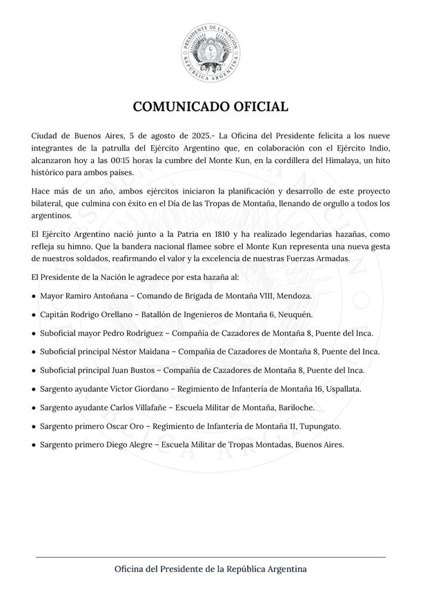 “Desde la Casa Rosada saludamos y felicitamos a los integrantes del Ejército Argentino que lograron hacer cumbre en el Himalaya por primera vez en la historia”, expresó el Gobierno en otro posteo.