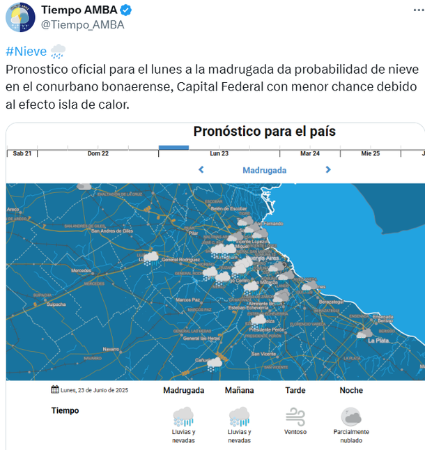 Según los informes del SMN la zona sur del Conurbano podría tener nevadas durante la madrugada y la madrugada de este lunes 23 de junio de 2025.