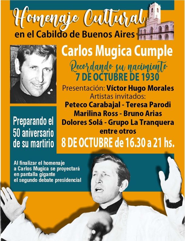 En comunicación con Liliana Isaguirre, organizadora del festival y cantante del Grupo La Tranquera, nos contó: “El 11 de mayo se cumplen 50 años del asesinato de Carlos Mugica en manos de la triple A, entonces los sacerdotes y las comunidades barriales decidieron iniciar una serie de eventos que tienen que ver con celebrar su vida. La fecha de cumpleaños de Mugica es el 7 de octubre y ese día hay un encuentro en el Cristo Obrero que es donde descansan su restos y el 8 de octubre hay un homenaje cultural en el patio del Cabildo Nacional donde van a estar Peteco Carabajal, Teresa Parodi, Dolores Solá , GLT Grupo La Tranquera, Bruno Arias y Marilina Ross, la grosa que compartió infinidad de momentos con Carlos y que incluso le cerraron la capilla tipo castigo porque la hizo cantar en el altar".