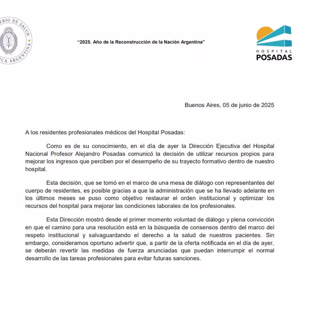 En medio de un clima de creciente tensión en el ámbito sanitario, el Hospital Nacional Posadas informó oficialmente que implementará un incremento en las remuneraciones de sus médicos residentes. Sin embargo, la medida fue acompañada por una advertencia tajante: quienes participen de la huelga convocada para el martes 10 de junio podrían enfrentar sanciones disciplinarias.