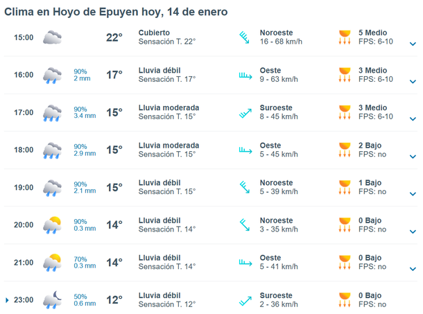 De acuerdo a lo señalado por el sitio Meteored, se esperan lluvias para toda la tarde y la noche, siendo el inicio de las precipitaciones a las 16 horas. Las mismas serán de variada intensidad, pero traerán el alivio necesario para la zona de incendios forestales.